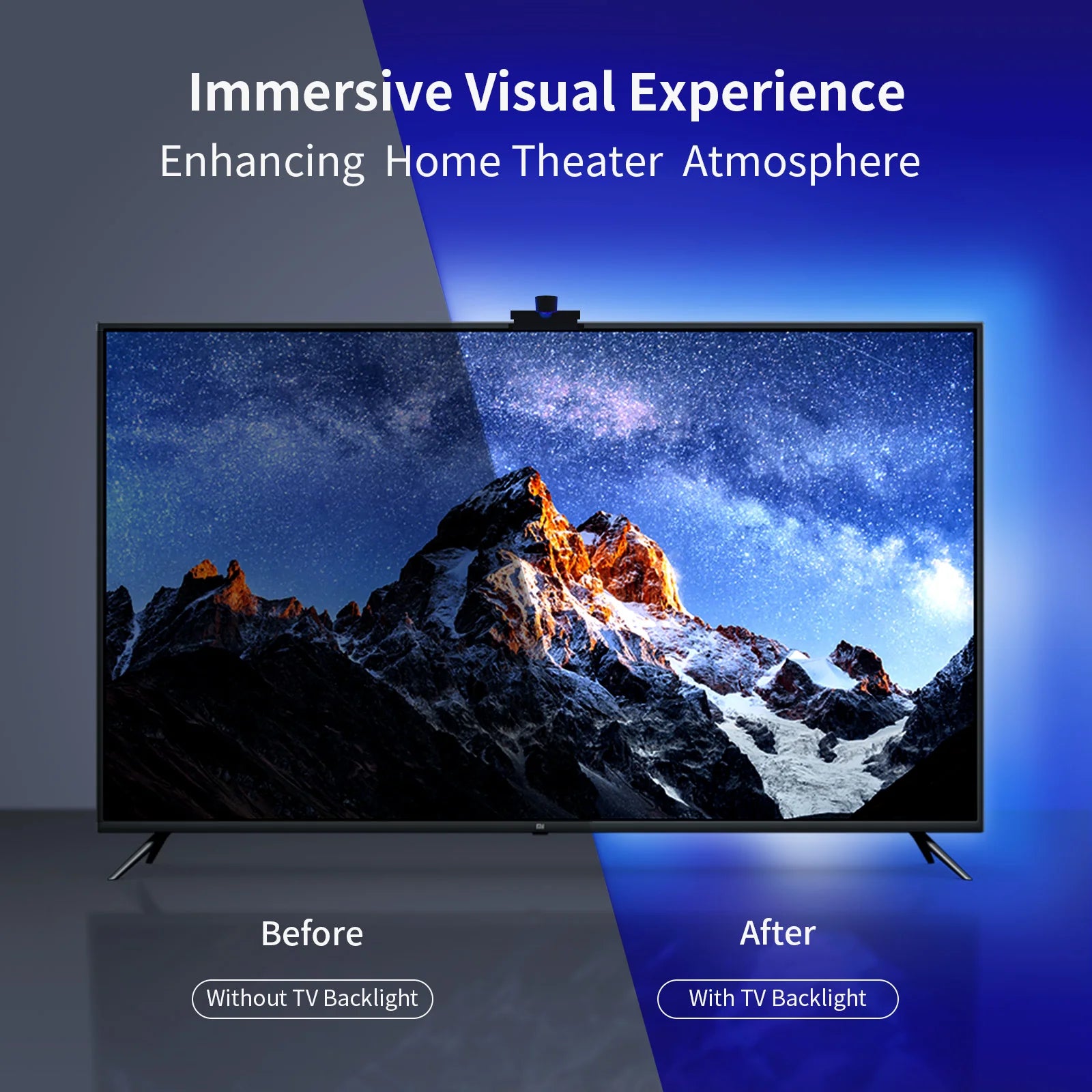 🛠 Instalación sencilla: Coloca la cámara en la parte superior central del televisor y adhiere las tiras LED a los cuatro lados de la pantalla (compatibles con televisores panorámicos 16:9)