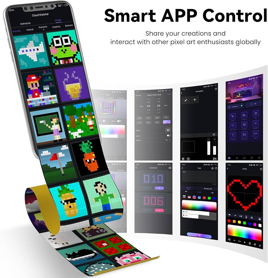 - Animaciones y grafitis personalizables: elige entre emoticonos, logotipos, personajes y más, o carga tus propias creaciones desde la app.